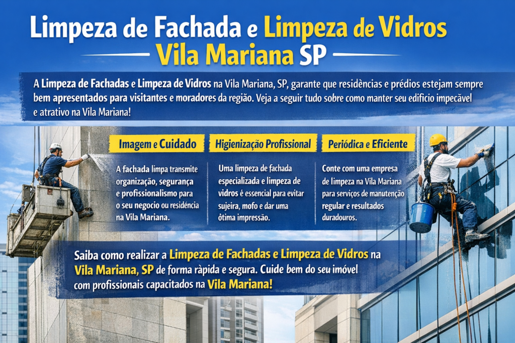 Limpeza de Fachadas e Vidros Vila Mariana SP Se você procura limpeza de fachadas e vidros na Vila Mariana SP, chegou ao lugar certo. A aparência de um imóvel é o primeiro contato visual com clientes, moradores e visitantes — e manter a fachada limpa não é apenas estética, mas também valorização do patrimônio. A […]